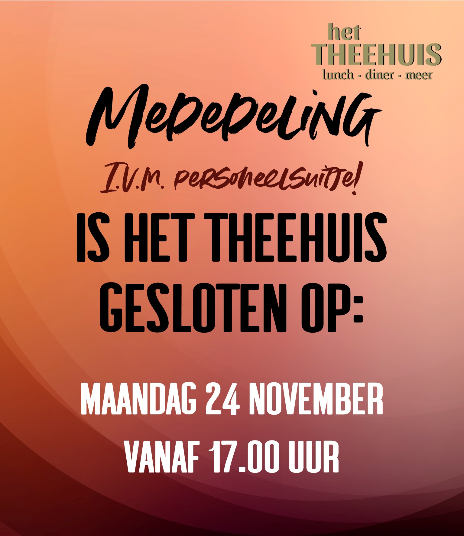 Wil je op de hoogte zijn van het laatste nieuws over Het Theehuis? Volg ons dan via onze socialmedia kanalen!